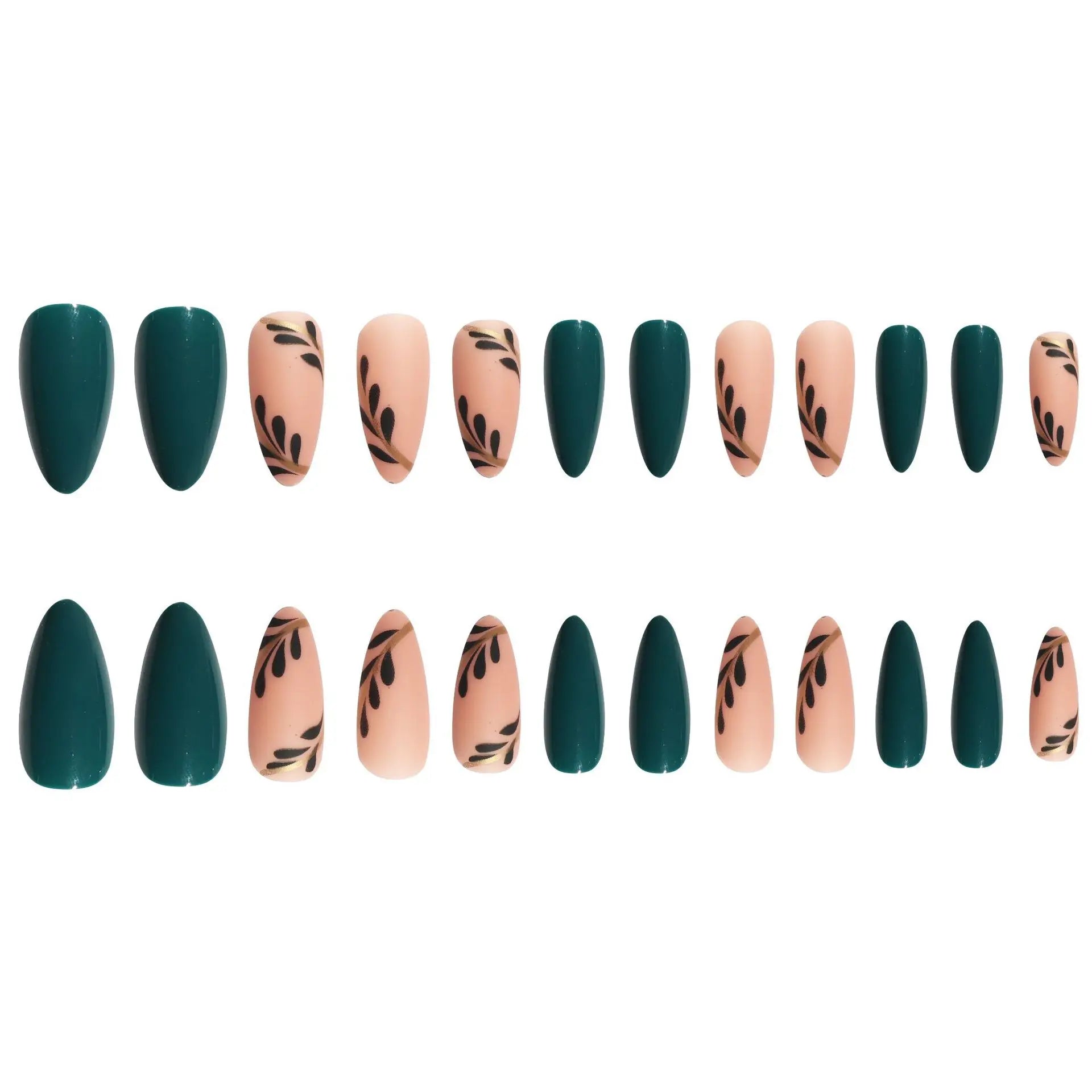 24pcs/box Women Long Almond Shaped False Nails Green Leaves Diy Fake Nail Artificial Acrylic Wearable Full Coverage Fingernail