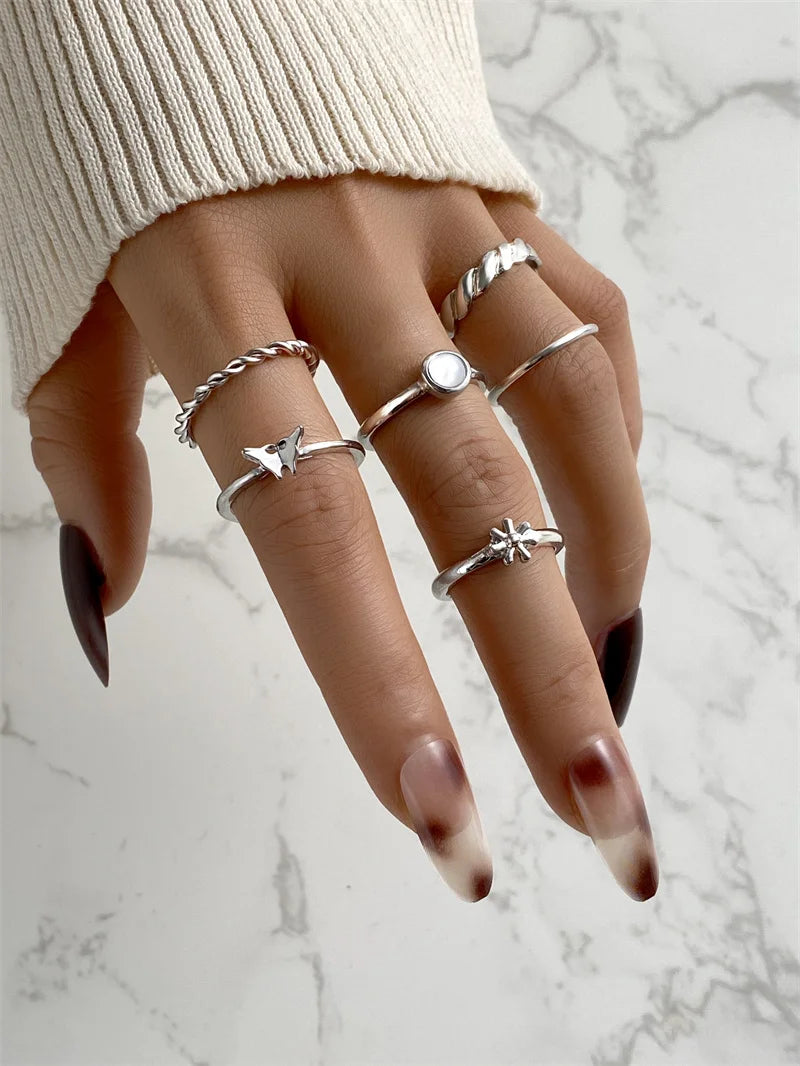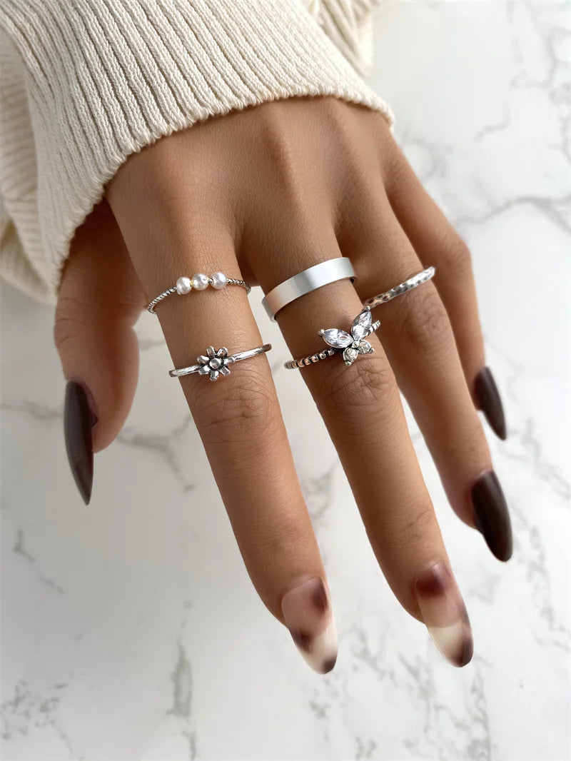 Bohemian Butterfly Pearl Rings Set for Women Shine Pearl Gothic Vintage Plated Retro Rhinestone Simple Finger Jewelry Gift