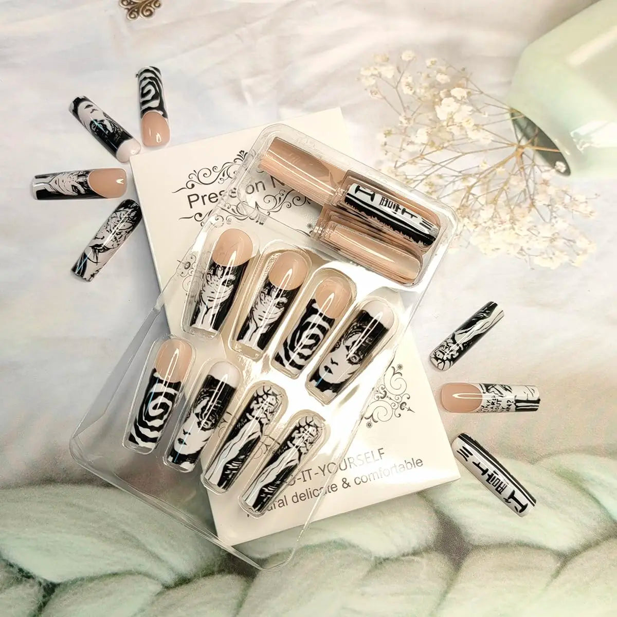 French Tips Press on Nails Long Fake Nails Black White Anime Comics Design Full Cover Punk Acrylic Artificial False Nails 24PCS